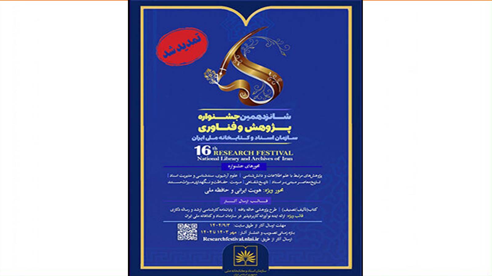 دبیرخانه شانزدهمین جشنواره پژوهش و فناوری سازمان اسناد و کتابخانه ملی ایران مهلت ارسال آثار برای شرکت در این جشنواره را تمدید کرد.