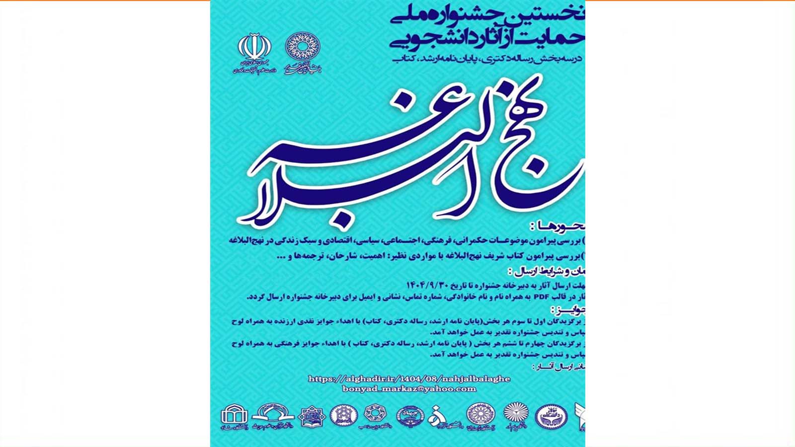 به نقل از تسنیم؛ نخستین جشنواره ملی حمایت و تقدیر از آثار دانشجویی نهجالبلاغه در مقطع کارشناسی ارشد و دکتری برگزار میشود. با عنایت به تأکید مقام معظم رهبری درباره ضرورت تبیین و ترویج مفاهیم گرانسنگ نهج البلاغه و با هدف شناسایی، حمایت و تجلیل از پژوهش های ارزشمند دانشجویی در زمینه معارف علوی و آموزههای نهجالبلاغه و تولید ادبیات علمی کاربردی پیرامون نهج البلاغه در دو مقطع کارشناسی ارشد و دکتری این جشنواره برگزار میشود.