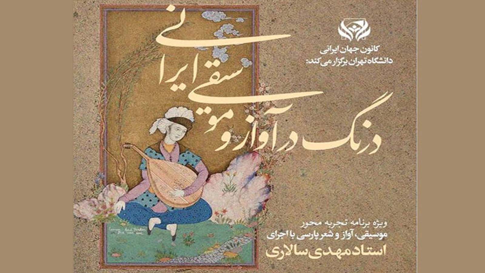 کانون جهانایرانی دانشگاه تهران برنامهای با عنوان «درنگ در آواز و موسیقی ایرانی» را با اجرای مهدی سالاری برگزار میکند.