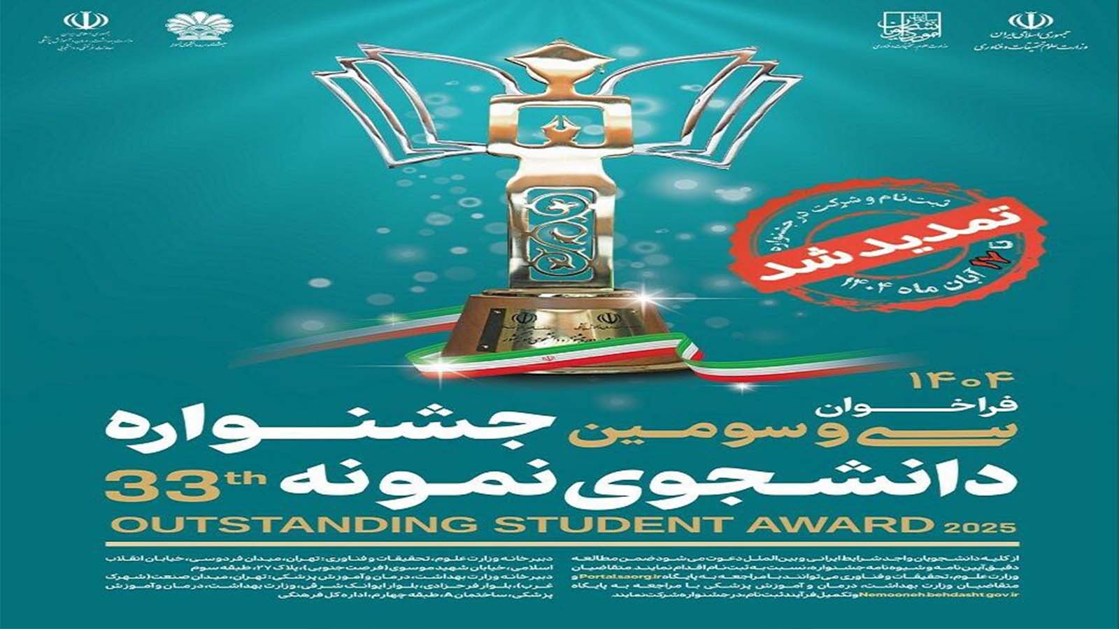 مهلت ثبت‌نام سی‌وسومین دوره جشنواره دانشجوی نمونه ۱۴۰۴ با توجه به استقبال دانشجویان و درخواست متعدد دانشگاه‌ها تا ۱۲ آذرماه تمدید شد.