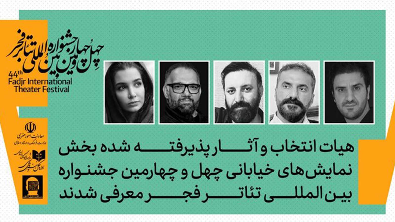 به نقل از مهر؛ از سوی دبیرخانه چهلوچهارمین جشنواره بینالمللی تئاتر فجر هیئت انتخاب بخش نمایشهای خیابانی این رویداد هنری که مدیریت آن را مریم کاظمی بر عهده دارد، اعلام و معرفی شدند.