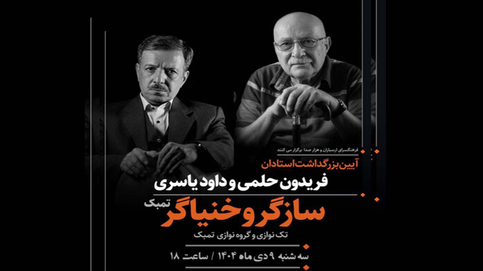 آئین بزرگداشت فریدون حلمی و داود یاسری ۲ هنرمند «سازگر» و «خنیاگر» تمبک، روز سهشنبه ۹ دی در فرهنگسرای ارسباران برگزار میشود.
